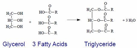 Телесните мазнини, както вече споменах, са главно складирани триглицериди (тъй като, както вече знаете, мастните клетки са изградени от около 90% триглицериди). Искам да отбележа, че мазнините, които приемате от храната, също са под формата на триглицериди. Химично погледнато, триглицеридите са съставени от глицерол (захарид) прикрепед към веригите на три свободни мастни киселини. Химичната структура на веригата на мастната киселина е това, което хората имат предвид, когато говорят за видовете мазнини – наситени, ненаситени и полиненаситени мазнини. Има се предвид структурата на определената верига на мастната киселина ( всеки триглицерид може да съдържа смес от наситени,ненаситени и полиненаситени мастно-киселинни вериги).