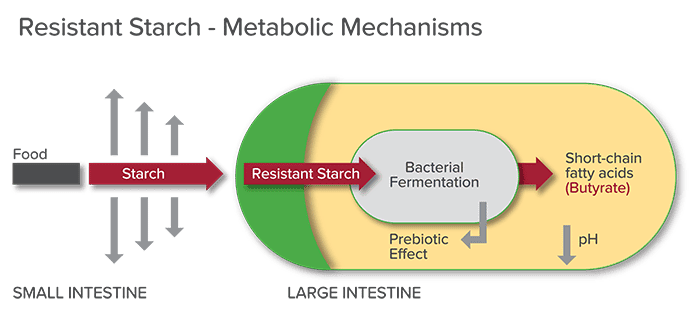 Имайки предвид горното, устойчивото нишесте е наименовано така, именно защото се „съпротивлява” на храносмилането.Повечето старчове биват разграждани до захар от ензими в нашето тънко черво, която захар след това се усвоява в кръвта. Не можем обаче да усвоим напълно всички видове старчове. Някои от тях – resistant starch (резистентните старчове) – не се усвояват напълно в тънкото черво. Проправят си път до дебелото черво, където чревните бактерии ферментират нишестето. Механизмът на РС може да видите на картинката вдясно.- Стимулират кръвообръщението в дебелото черво