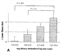 – –Наличните изследвания сочат, че храненето богато на холестерол, може да окаже положителен ефект върху мускулния растеж и силата, чрез повишаване издръжливостта на мускулните клетки и сигнализацията за мускулен растеж. Ползотворният прием е поне 7,2мг холестерол на 1 кг (чиста маса) и повече от 400мг. При мъжете.