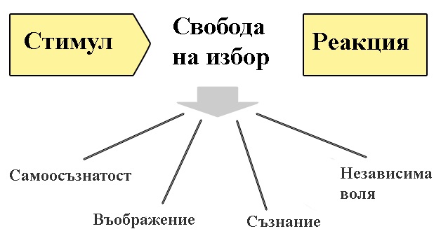 При много хора тази втора част от формулата липсва. Техният избор е несъзнателен, инстинктивен, подтикнат от стимула. Реално погледнато, това не е избор, а се преминава от стимул към реакция.